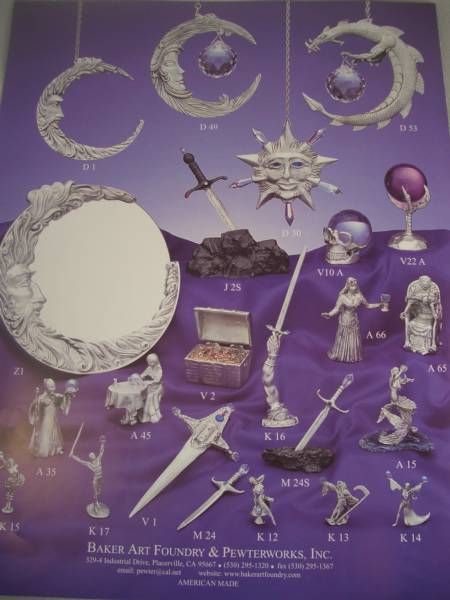 Baker Art Foundry & Pewterworks has been in existence since 1969. Our pewter gift lines have changed and evolved much during the last 41 years. We have added too many wonderful designs to show in a few photo's. Fantasy is always with us, and hopefully will be forever. It is with great pride that we cast to order..please contact us for more information.